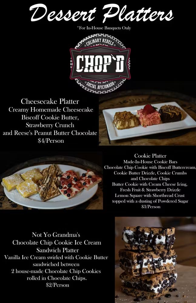 Our new Dessert Packages include made-from-scratch Cookie Bar Platters ($3/Person) and made-in-house Cheesecake Platters ($4/Person) as well as Ice Cream Sandwich Platters ($2/Person).